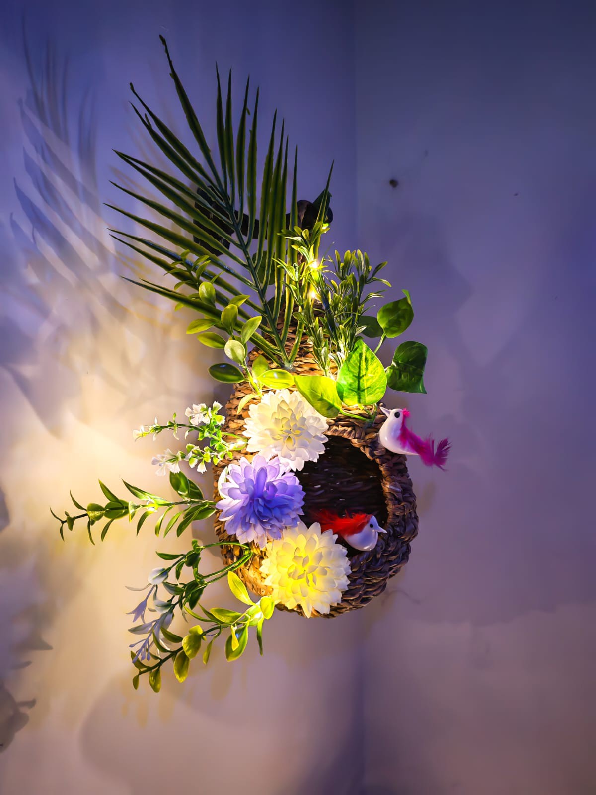 পাখির বাসার সাথে ফুল এবং লাইটের দারুন কম্বিনেশন। প্রতিটি পাখির